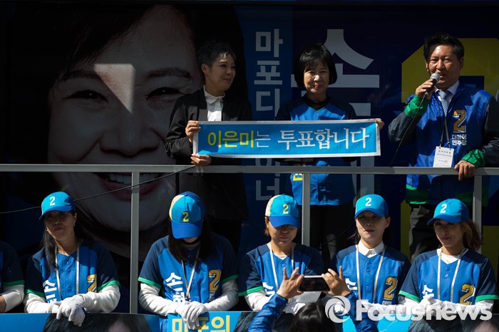 (서울=포커스뉴스) 20대 총선을 이틀 앞둔 11일 오후 서울 마포구 망원시장 일대에서 정청래 의원이 가수 이은미와 함께 손혜원 더불어민주당 마포구을 후보 지지를 호소하고 있다.