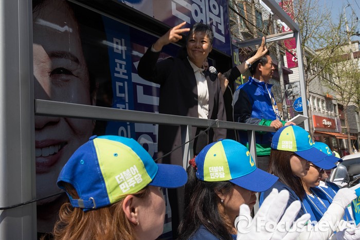 (서울=포커스뉴스) 20대 총선을 이틀 앞둔 11일 오후 서울 마포구 망원시장 일대에서 손혜원 더불어민주당 마포구을 후보가 가수 이은미와 정청래 의원과 함께 선거유세를 하고 있다.