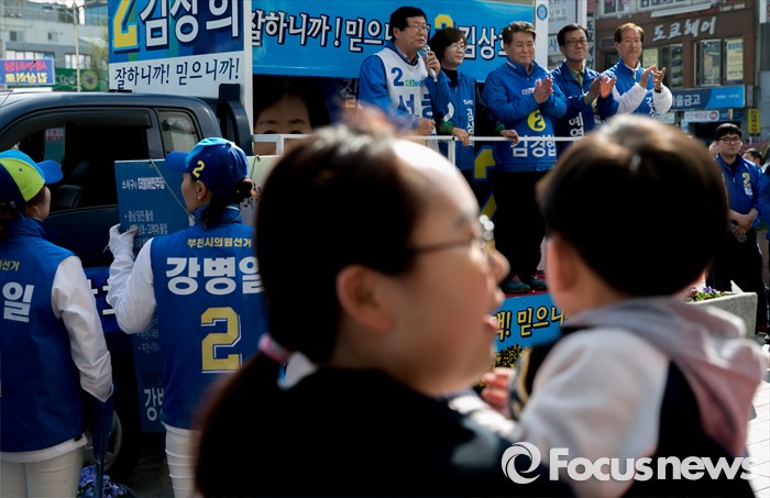 (부천=포커스뉴스) 20대 총선을 이틀 앞둔 11일 오후 경기도 부천역 남부광장에서 한 엄마와 아이가 더불어민주당 부천지역 합동유세를 지켜보고 있다.