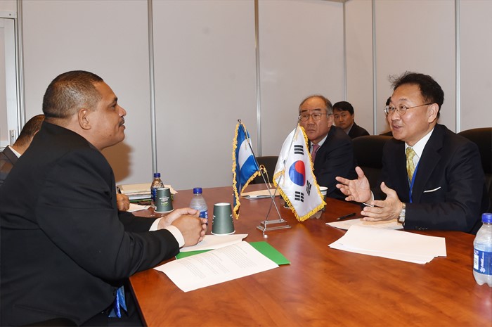 (서울=포커스뉴스) 2016년 IDB 연차총회 참석차 바하마 낫쏘를 방문중인 유일호 부총리 겸 기획재정부 장관이 10일(현지시간) 아코스타 몬딸반 니카라과 재무장관과 양자회담을 갖고 있다. <사진제공=기획재정부>