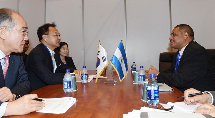 (서울=포커스뉴스) 2016년 IDB 연차총회 참석차 바하마 낫쏘를 방문중인 유일호 부총리 겸 기획재정부 장관이 10일(현지시간) 아코스타 몬딸반 니카라과 재무장관과 양자회담을 갖고 있다. <사진제공=기획재정부>