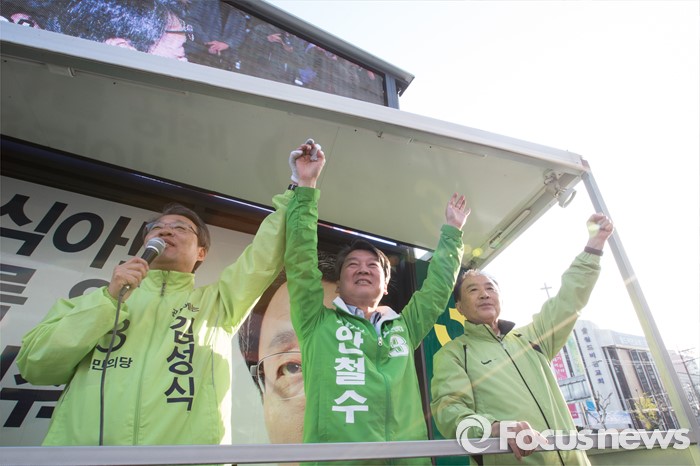 (서울=포커스뉴스) 안철수 국민의당 상임공동대표(가운데)가 11일 오후 서울 관악구 롯데백화점 앞에서 김성식 관악갑 후보 지원 유세를 하고 있다.