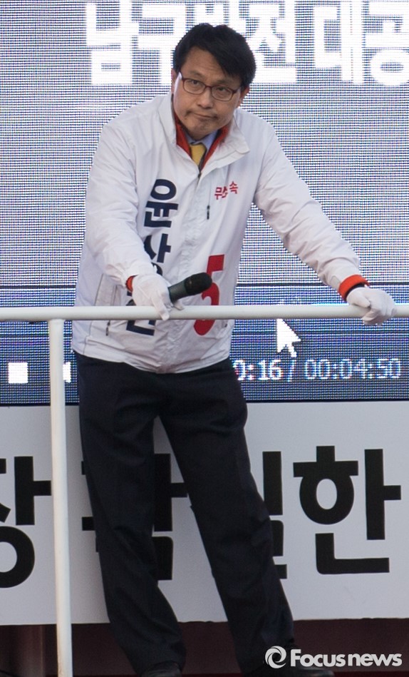 (인천=포커스뉴스) 20대 총선을 이틀 앞둔 11일 오후 인천 남구 제물포역 앞에서 윤상현 무소속 남구을 후보가 유권자에게 지지호소 하고 있다.