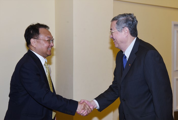 (서울=포커스뉴스) 2016년 IDB 연차총회 참석차 바하마 낫쏘를 방문중인 유일호 부총리 겸 기획재정부 장관이 11일(현지시간) 멜리아 호텔에서 저우 샤오촨 중국 인민은행 총재와 면담에 앞서 악수를 하고 있다. <사진제공=기획재정부>