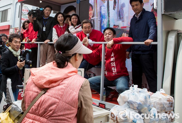 (수원=포커스뉴스) 4.13 총선을 하루 앞둔 12일 오전 경기 수원 정자시장에서 박종희 새누리당 수원시갑 후보 지원유세에 나선 김무성 대표가 유권자들에게 박 후보의 지지를 호소하고 있다.