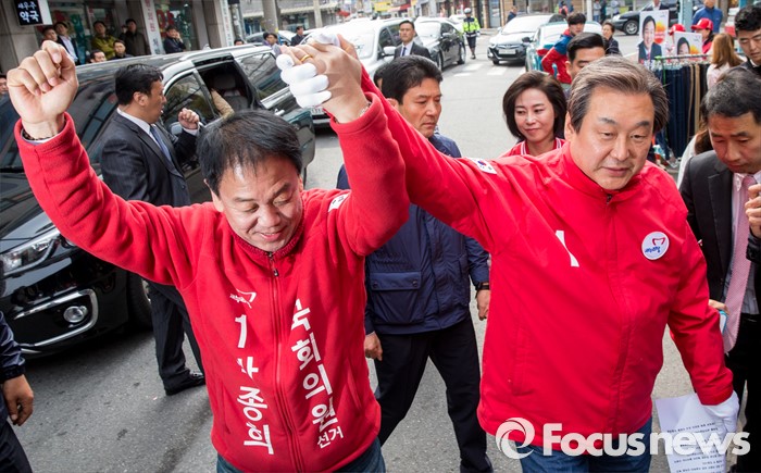 (수원=포커스뉴스) 4.13 총선을 하루 앞둔 12일 오전 경기 수원 정자시장에서 박종희 새누리당 수원시갑 후보 지원유세에 나선 김무성 대표가 유권자들에게 박 후보의 지지를 호소하고 있다.