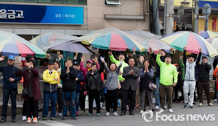 (서울=포커스뉴스) 12일 오전 서울 성동구 금장시장 앞에서 안철수 국민의당 상임공동대표와 서경선 중구성동구갑 후보, 정호준 중구성동구을 후보 지지자들이 환호하고 있다.