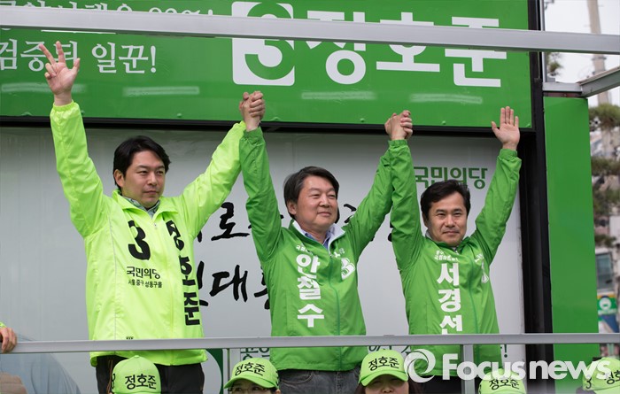 (서울=포커스뉴스) 안철수(가운데) 국민의당 상임공동대표가 12일 오전 서울 성동구 금장시장 앞에서 서경선(오른쪽) 중구성동구갑 후보와 정호준(왼쪽) 중구성동구을 후보 지원유세를 하고 있다.