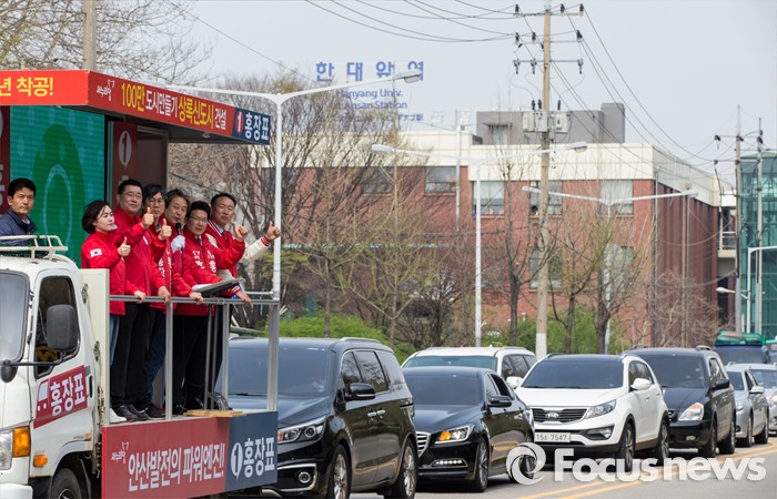 (안산=포커스뉴스) 4.13 총선을 하루 앞둔 12일 오전 경기 안산시 한대앞역 인근에서 홍장표 새누리당 안산시상록구을 후보 지원유세에 나선 김무성 대표가 유권자들의 지지를 호소하고 있다.