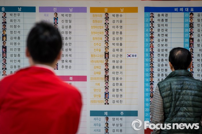 (서울=포커스뉴스) 제20대 국회의원선거를 하루 앞둔 12일 오전 서울 영등포구 새누리당사 선거상황실에 무투표로 당선이 확정된 이군현 새누리당 통영시고성군 후보 이름 옆에 '당선' 스티커가 붙어 있다.