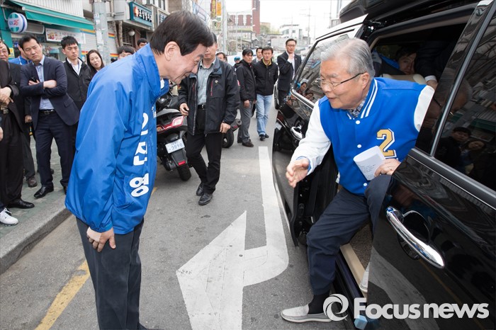 (서울=포커스뉴스) 2016 제20대 국회의원선거를 하루 앞둔 12일 오후 서울 용산구 후암시장 인근에서 진영 서울 용산구 후보가 유세를 지원하러 온 김종인 더불어민주당 비대위 대표 겸 선대위원장을 맞이하고 있다.
