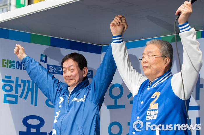 (서울=포커스뉴스) 2016 제20대 국회의원선거를 하루 앞둔 12일 오후 서울 용산구 후암시장 인근에서 김종인 더불어민주당 비대위 대표 겸 선대위원장과 진영 서울 용산구 후보가 유권자들에게 지지를 호소하고 있다.