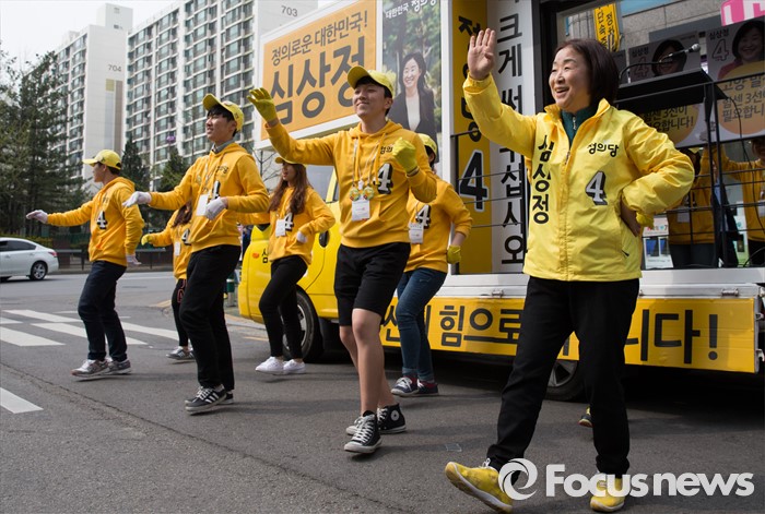 (고양=포커스뉴스) 제20대 국회의원 선거를 하루 앞둔 12일 오후 심상정 정의당 고양갑 후보가 경기 고양시 롯데마트 화정점 앞에서 선거운동원들과 함께 율동을 선보이고 있다.
