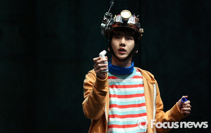 (서울=포커스뉴스) 12일 오후 서울 종로구 아트원씨어터에서 열린 연극 '지구를 지켜라' 프레스콜에 참석한 배우 키가 주요장면을 시연하고 있다.