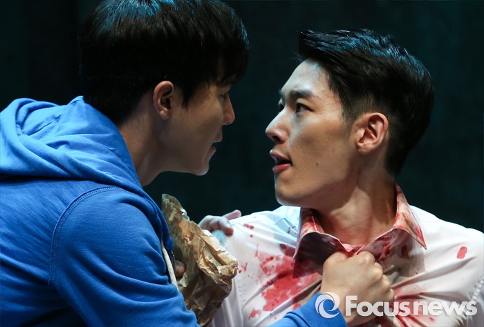 (서울=포커스뉴스) 12일 오후 서울 종로구 아트원씨어터에서 열린 연극 '지구를 지켜라' 프레스콜에 참여한 배우 이율(왼족)과 김도빈이 주요장면을 시연하고 있다.
