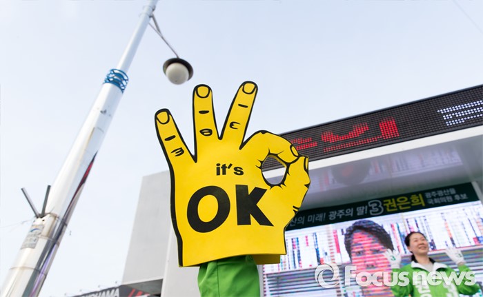 (광주=포커스뉴스) 4.13총선을 하루 앞둔 12일 오후 광주 광산구 타이어테크 수완점 앞에서 권은희 국민의당 광산구을 후보 선거운동원들이 지지를 호소하고 있다.