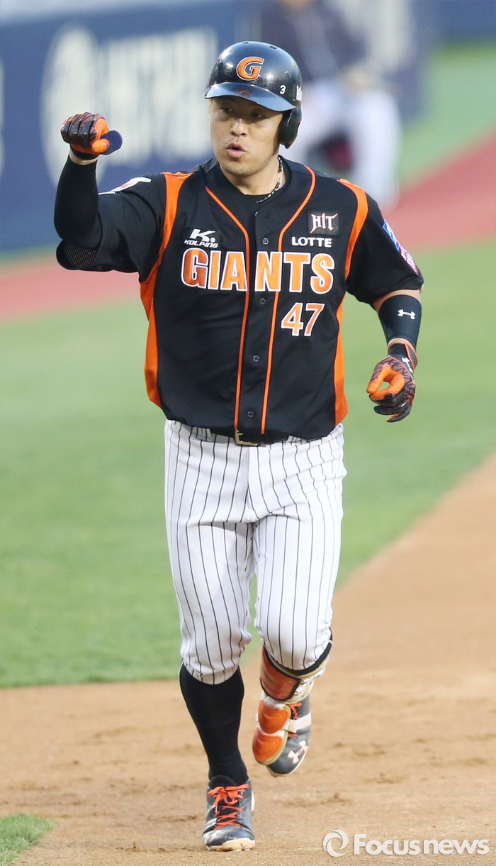 (서울=포커스뉴스) 12일 서울 잠실구장에서 열린 2016 프로야구 롯데-LG 경기 1회초 2사 2루에서 롯데 강민호가 좌얼 2점 홈런을 치고 주먹을 치켜들며 3루를 돌고 있다.