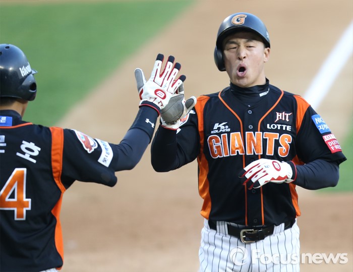 (서울=포커스뉴스) 12일 서울 잠실구장에서 열린 2016 프로야구 롯데-LG 경기 1회초 1사 1,3루에서 롯데 최준석의 우익수 오른쪽에 떨어지는 2루타때 1루주자 손아섭이 홈인하고 있다.