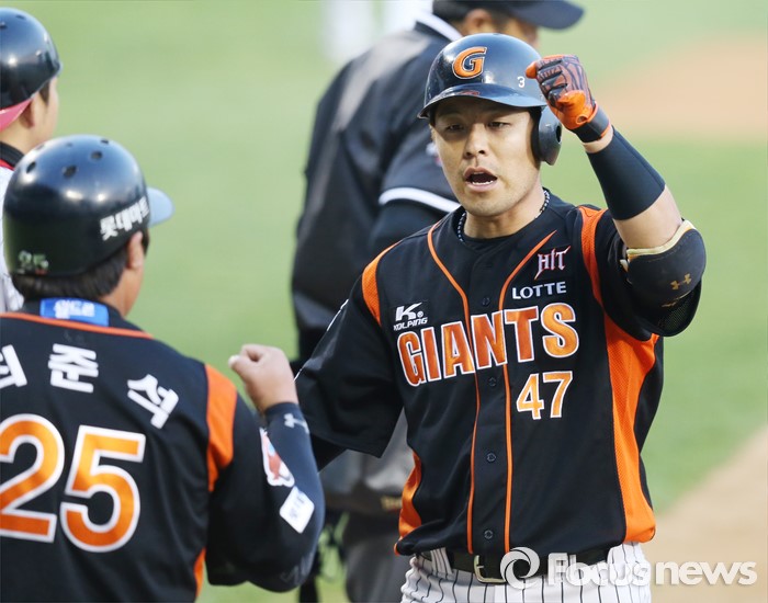 (서울=포커스뉴스) 12일 서울 잠실구장에서 열린 2016 프로야구 롯데-LG 경기 1회초 2사 2루에서 롯데 강민호가 좌월 2점 홈런을 치고 선행주자 최준석의 환영을 받으며 홈인하고 있다.