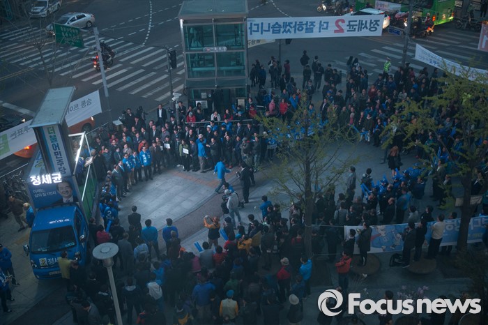 (서울=포커스뉴스) 20대 총선을 하루 앞둔 12일 오후 서울 종로구의 한 아파트 일대에서 정세균 더불어민주당 종로구 후보가 막바지 선거유세를 하고 있다.