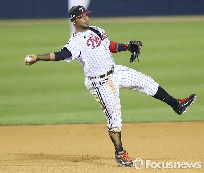 (서울=포커스뉴스) 12일 서울 잠실구장에서 열린 2016 프로야구 롯데-LG 경기 6회초 2사후 LG 3루수 히메네스가 롯데 강민호의 타구를 잡아 1루로 송구하고 있다.