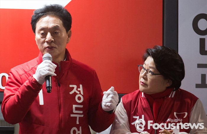 (서울=포커스뉴스) 제20대 국회의원 선거를 하루 앞둔 12일 오후 서울 은평구 증산역 앞에서 정두언 새누리당 서대문을 후보 아내 이화익 씨가 정 후보를 바라보고 있다.
