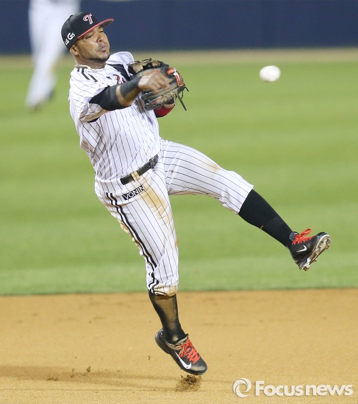 (서울=포커스뉴스) 12일 서울 잠실구장에서 열린 2016 프로야구 롯데-LG 경기 6회초 2사후 LG 3루수 히메네스가 롯데 강민호의 타구를 잡아 1루로 송구하고 있다.