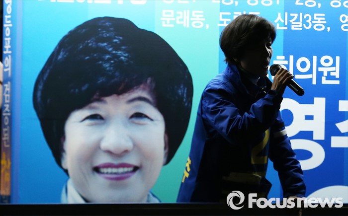 (서울=포커스뉴스) 4.13총선을 하루 앞둔 12일 오후 서울 영등포구 영등포역 인근에서 김영주 더불어민주당 영등포갑 후보가 선거유세를 하고 있다.