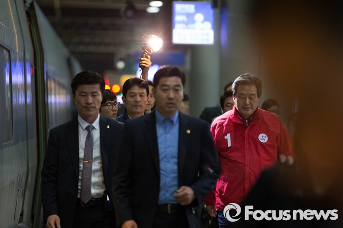 (서울=포커스뉴스) 20대 총선을 하루 앞둔 12일 오후 서울 용산구 서울역 KTX 플랫폼에서 김무성 새누리당 대표가 부산으로 기차로 향하고 있다.