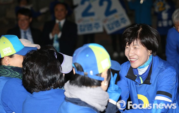 (서울=포커스뉴스) 4.13총선을 하루 앞둔 12일 오후 서울 영등포구 영등포역 인근에서 김영주 더불어민주당 영등포갑 후보 지지자와 악수하고 있다.