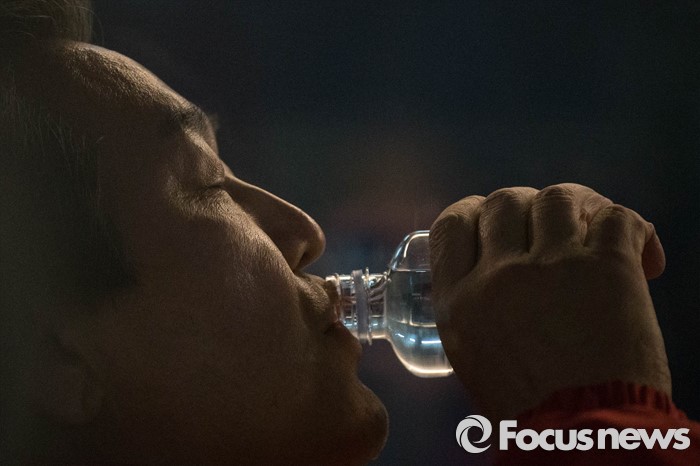 (서울=포커스뉴스) 20대 총선을 하루 앞둔 12일 오후 서울 용산구 서울역 KTX 플랫폼에서 김무성 새누리당 대표가 부산으로 가는 기차에서 물을 마시고 있다.
