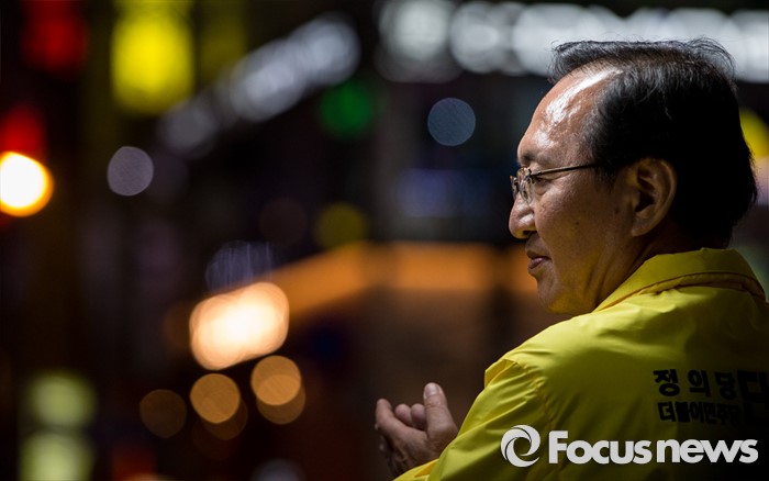 (창원=포커스뉴스) 4.13총선 선거운동 마지막날인 12일 오후 경남 창원시 상남분수광장에서 노회찬 정의당 창원 성산구 후보가 유권자들의 지지를 호소하고 있다.
