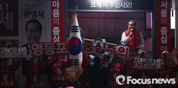 (서울=포커스뉴스) 4.13총선을 하루 앞둔 12일 오후 서울 영등포구 신풍역역 인근에서 권영세 새누리당 영등포을 후보가 지지를 호소하고 있다.