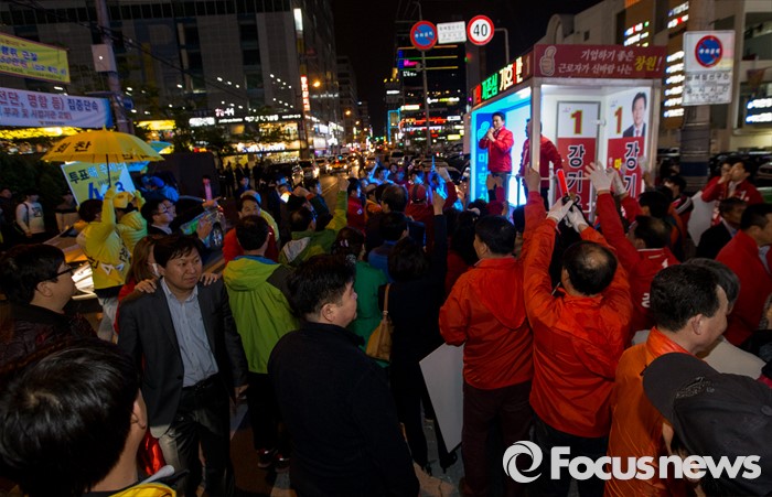(창원=포커스뉴스) 4.13총선 선거운동 마지막날인 12일 오후 경남 창원시 상남분수광장에서 노회찬 정의당 창원 성산구 후보, 강기윤 새누리당 후보 양측 지지자들이 뒤엉켜 혼잡을 빚고 있다.