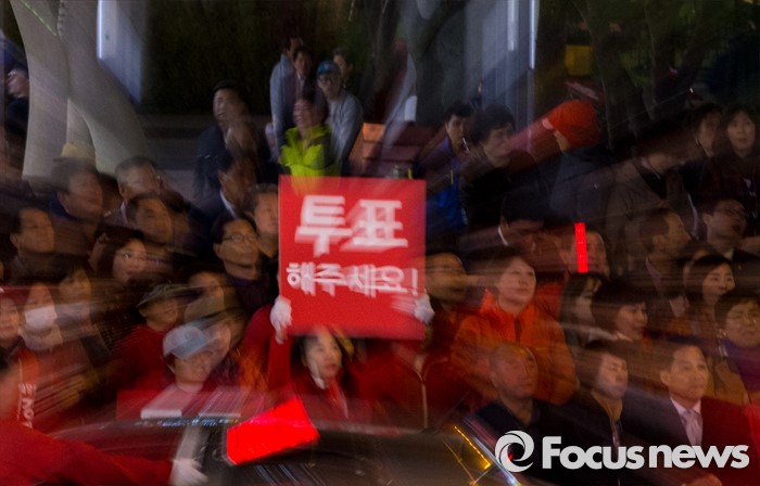 (창원=포커스뉴스) 4.13총선 선거운동 마지막날인 12일 오후 경남 창원시 상남분수광장에서 열린 강기윤 새누리당 창원 성산구 후보 선거유세에 참석한 강 후보 지지자들이 투표를 독려하는 손팻말을 흔들고 있다.