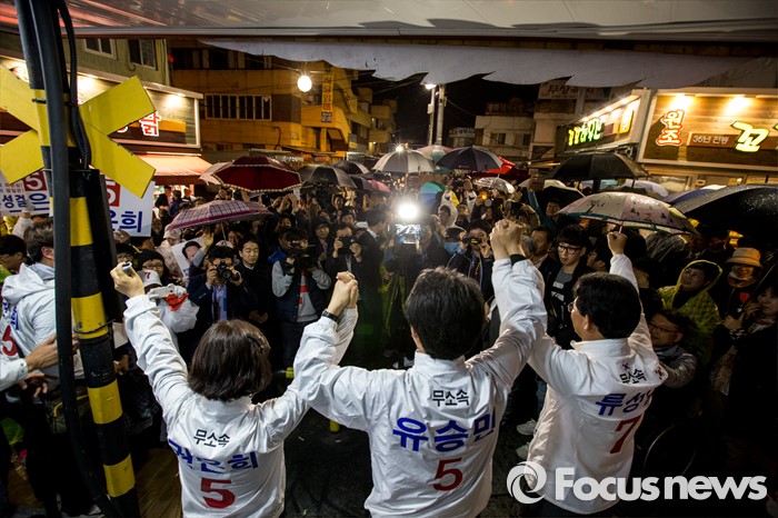(대구=포커스뉴스) 권은희(왼쪽부터) 무소속 대구 북구갑 후보, 유승민 무소속 대구 동구을 후보, 류성걸 대구 동구갑 후보가 12일 오후 대구광역시 동구 평화시장 닭똥집골목에서 마무리 합동유세를 하며 손을 맞잡고 지지자들에게 인사하고 있다.