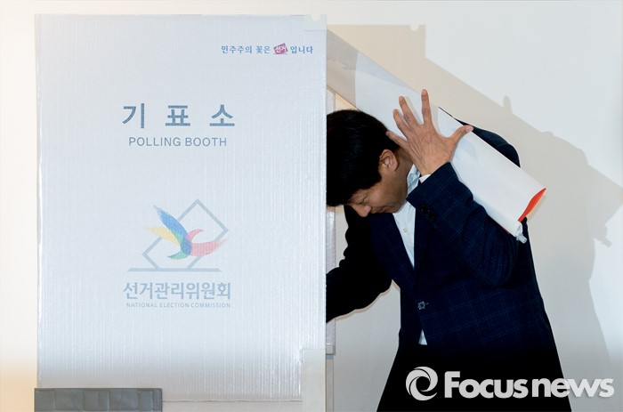 (서울=포커스뉴스) 2016 제20대 국회의원선거날인 13일 오전 서울 종로구 동성고등학교 백주년기념관에 설치된 투표소에서 오세훈 새누리당 종로 후보가 기표를 마치고 나오던 중 기표소 가림막과 부딪혀 떨어지고 있다.