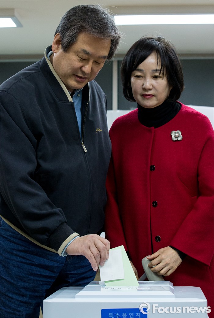(부산=포커스뉴스) 제20대 국회의원선거일인 13일 오전 부산 영도구 동삼1동 제6투표소에서 김무성 새누리당 대표와 아내 최양옥 씨가 투표하고 있다.