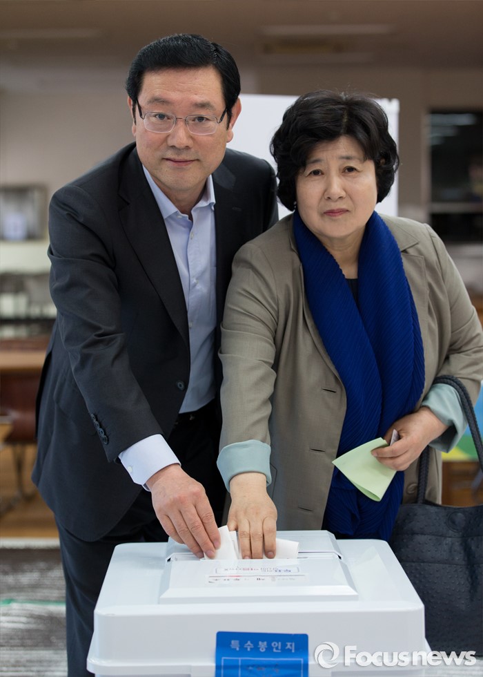 (광주=포커스뉴스) 제20대 국회의원 선거일인 13일 오전 광주 광산구 산월동 봉산초등학교에서 이용섭(왼쪽) 더불어민주당 광주 광산구을 후보가 부이 신영옥씨와 투표를 하고 있다.