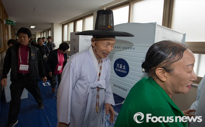 (논산=포커스뉴스) 제20대 국회의원 선거가 시작된 13일 오전 충남 논산 연산면 제1투표소에서 양지서당 유복엽 큰 훈장과 가족들이 투표를 마치고 투표소를 나서고 있다.