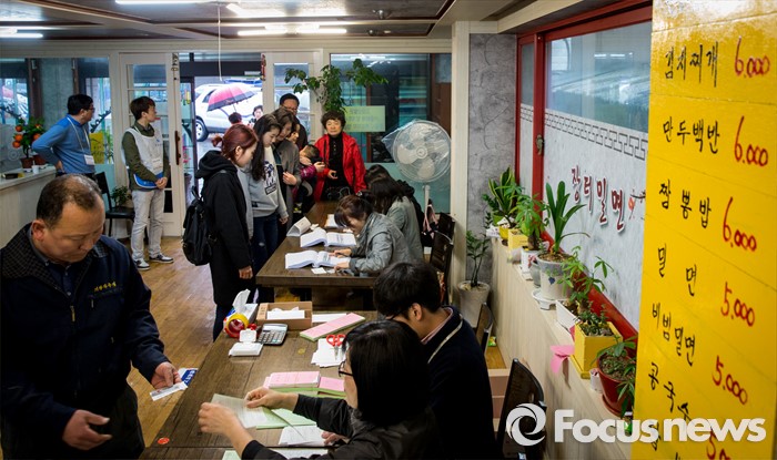 (부산=포커스뉴스) 제20대 국회의원선거일인 13일 오전 부산 사하구 하단1동 제1투표소에서 유권자들이 투표하고 있다. 이 투표소는 하단전통시장 내 한 밀면 음식점에 마련됐다.