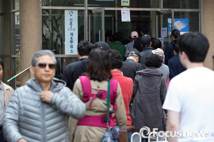 (서울=포커스뉴스) 2016 제20대 국회의원선거날인 13일 오후 서울 서초구 서이초등학교에 마련된 투표소에서 유권자들이 투표를 하기 위해 대기하고 있다.