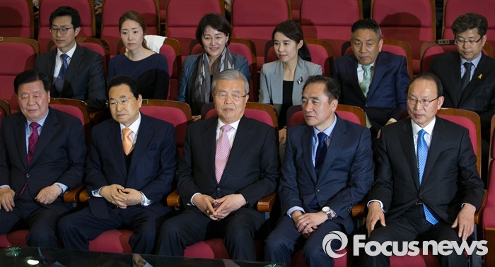 (서울=포커스뉴스) 20대 총선 투표일인 13일 오후 서울 여의도 국회 의원회관 대회의실에 마련된 더불어민주당 개표상황실에서 김종인 비대위 대표 겸 선대위원장 등 선대위원들이 출구조사 및 개표방송을 시청하고 있다. 앞줄 왼쪽부터 이근식, 송현섭 부위원장, 김 대표, 정장선 총선기획단장, 최운열 국민경제상황실장.