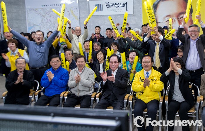 (창원=포커스뉴스) 제20대 국회의원선거가 끝난 13일 오후 창원시 성산구의 선거사무소에서 노회찬 정의당 창원 성산구 후보가 '예측 당선'이라는 방송사 출구조사 결과에 지지자들과 함께 기쁨을 표하고 있다. 노 후보의 좌측은 권영길 전 민주노동당 대표, 우측은 부인 김지선 씨.