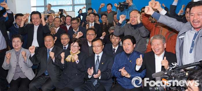 (세종=포커스뉴스) 제20대 국회의원선거가 마감된 가운데 이해찬 무소속 후보가 13일 오후 세종시 도담동 선거사무소에서 방송3사 출구조사 결과 앞서는 것으로 나타나자 지지자들과 함께 환호하고 있다.