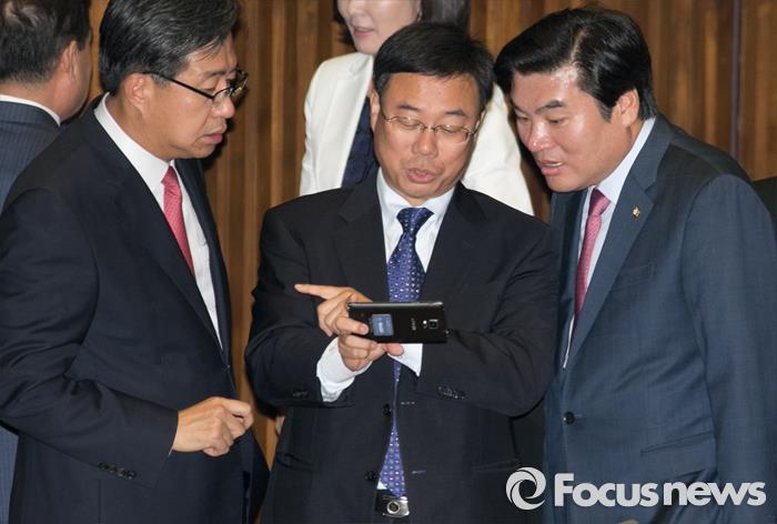 (서울=포커스뉴스) 13일 오후 6시 KBS·MBC·SBS 지상파 방송3사가 공동조사, 발표한 4·13 총선 출구조사 결과에 따르면 경기 성남중원 지역구에서는 새누리당 신상진후보가43.1%로 당선이 예상된다.(서울=포커스뉴스) 1일 오후 서울 여의도 국회에서 열린 337회 국회(정기회) 개회식에 참석한 원유철(오른쪽부터) 새누리당 원내대표, 신상진, 전하진 의원이 핸드폰을 보며 대화하고 있다. 2015.09.01 박동욱 기자