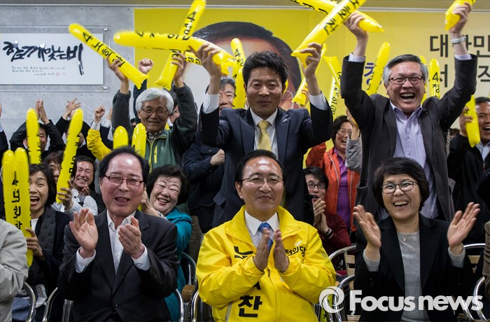 (창원=포커스뉴스) 제20대 국회의원선거가 끝난 13일 오후 창원시 성산구의 선거사무소에서 노회찬 정의당 창원 성산구 후보가 '예측 당선'이라는 방송사 출구조사 결과에 지지자들과 함께 기쁨을 표하고 있다. 노 후보의 좌측은 권영길 전 민주노동당 대표, 우측은 부인 김지선 씨.