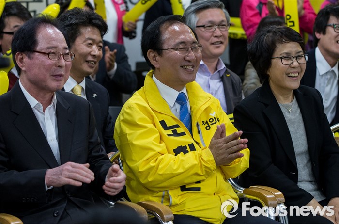 (창원=포커스뉴스) 제20대 국회의원선거가 끝난 13일 오후 창원시 성산구의 선거사무소에서 노회찬 정의당 창원 성산구 후보가 '예측 당선'이라는 방송사 출구조사 결과에 박수 치며 기뻐하고 있다. 노 후보의 좌측은 권영길 전 민주노동당 대표, 우측은 부인 김지선 씨.