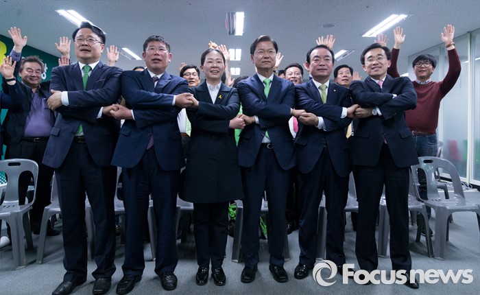 (광주=포커스뉴스) 제20대 국회의원 선거일인 13일 오후 광주 서구 국민의당 광주광역시당에서 국민의당 지역구 후보자들이 모여 출구조사 결과를 보고 기념촬영을 하고 있다. 왼쪽부터 송기석 서구갑 후보, 김경진 북구갑 후보, 권은희 광산구을 후보, 천정배 서구을 후보, 장병완 동구남구 갑 후보, 김성환 광주 동구청장 재선거 후보.