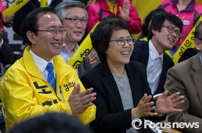 (창원=포커스뉴스) 제20대 국회의원선거가 끝난 13일 오후 창원시 성산구의 선거사무소에서 노회찬 정의당 창원 성산구 후보가 '예측 당선'이라는 방송사 출구조사 결과에 부인 김지선 씨와 함께 기쁨을 나누고 있다.
